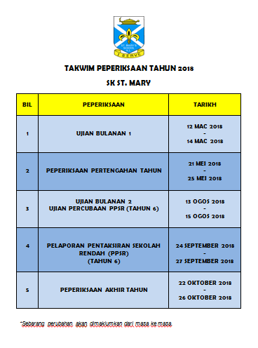 Takwim Peperiksaan Tahun 2018 Sekolah Kebangsaan St Mary