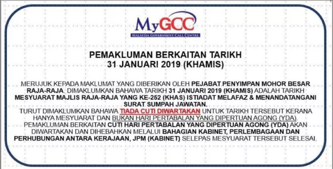 Jan 31 Is Not Public Holiday For Agong S Inauguration Claims Mygcc