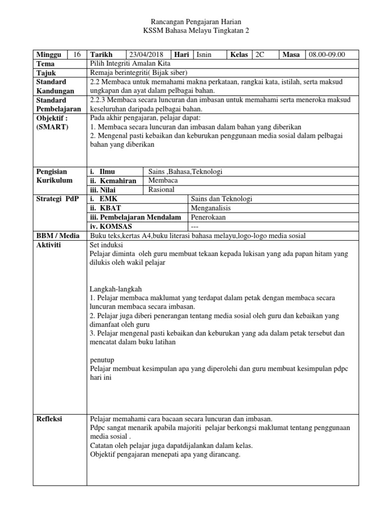 Rancangan Pengajaran Harian Bm Kssm Tingkatan 1