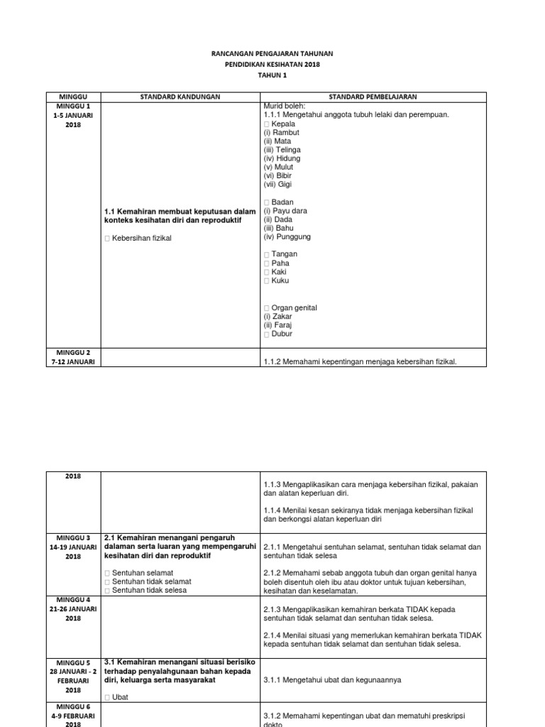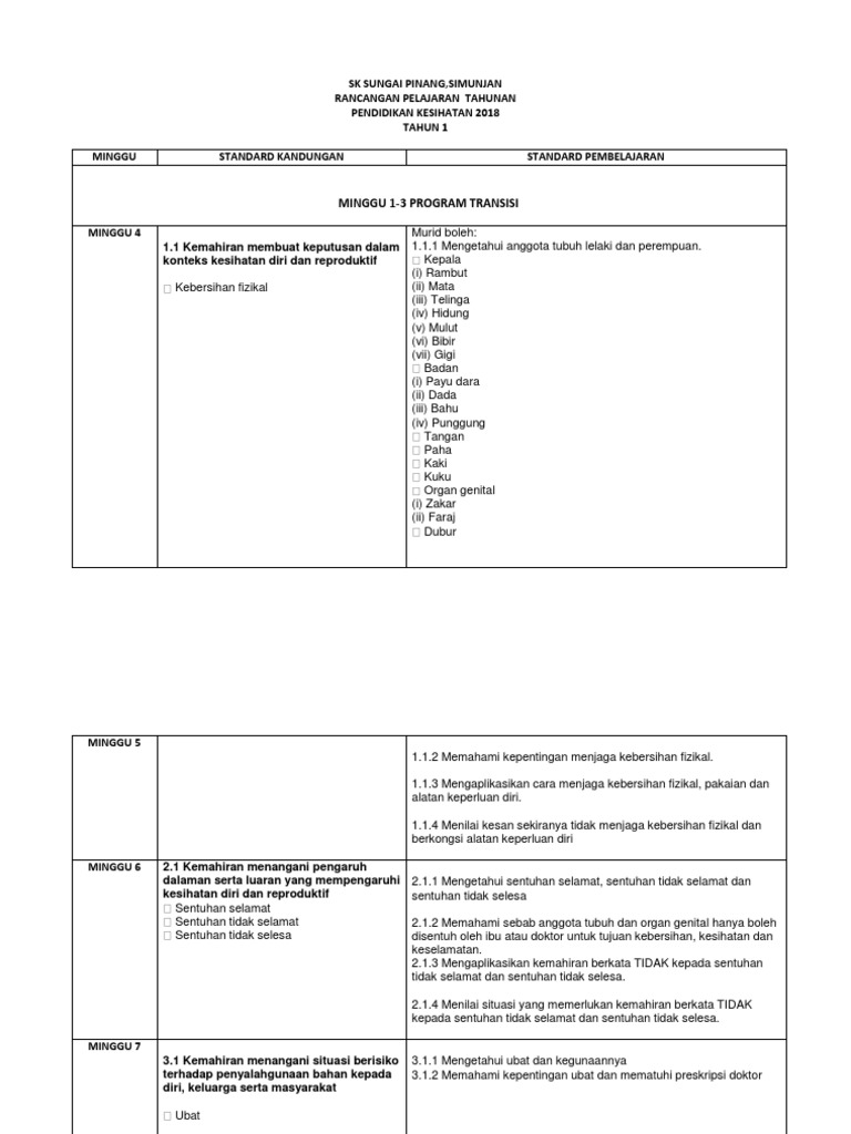 Sk Sungai Pinang Simunjan Rancangan Pelajaran Tahunan Pendidikan Kesihatan 2018 Tahun 1 Minggu Standard Kandungan Standard Pembelajaran